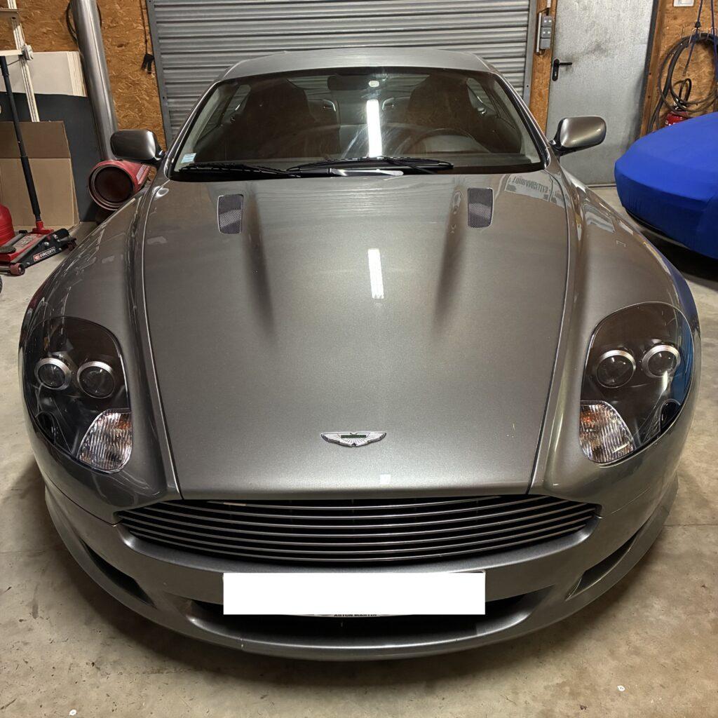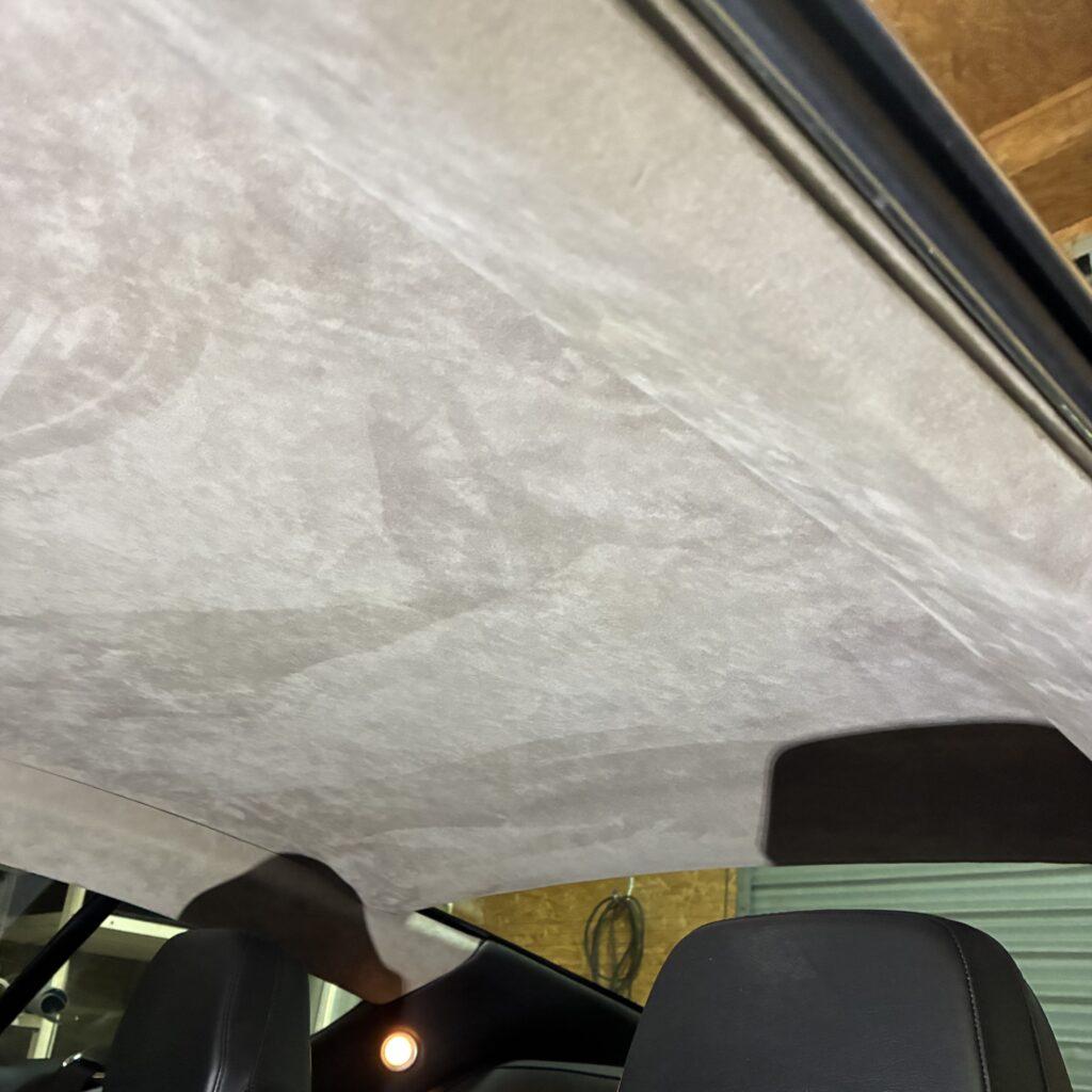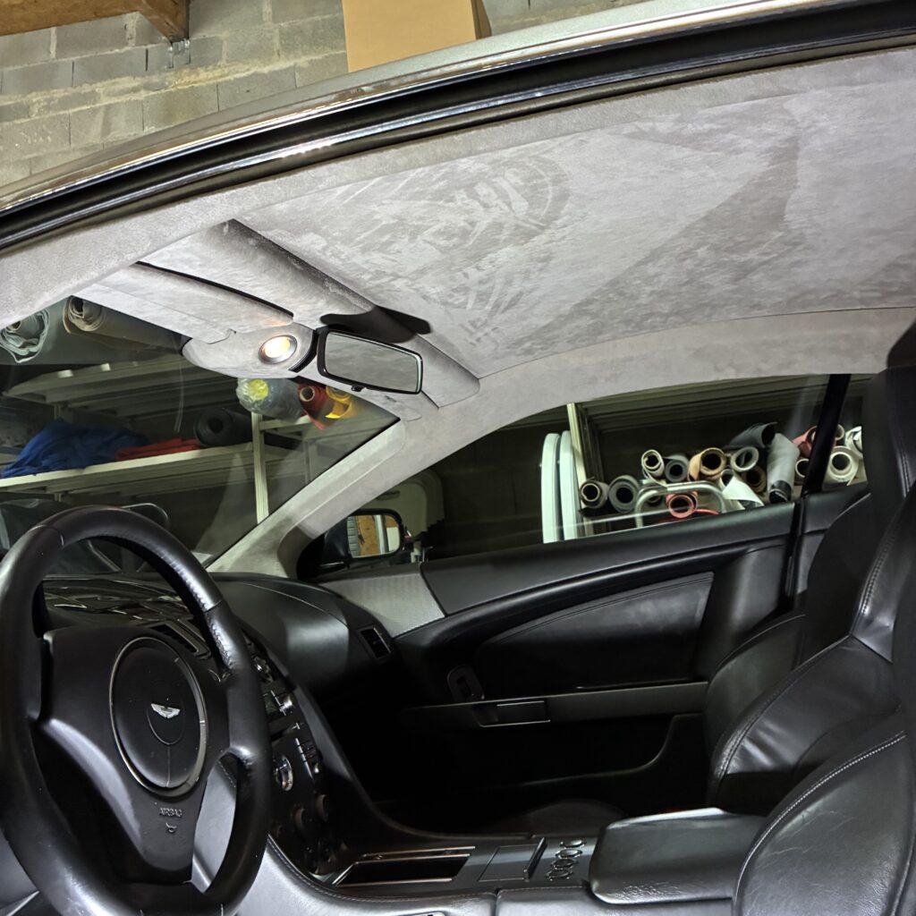 Réfection ciel de toit ASTON MARTIN DB9 avec démontage et remontage des carters. Collage de l’alcantara après nettoyage du support.